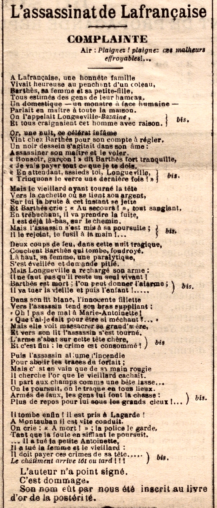 - Résumé : Le 29 septembre 1895 au soir, trois personnes sont tuées au lieu-dit Bley, sur la commune de Lafrançaise (Tarn-et-Garonne). Il s’agit de Bernard Barthez, cultivateur de 61 ans, son épouse Marie Delbosc, 57 ans, et leur petite-fille Rose Marie Devautour, 3 ans. On les retrouve tués de plusieurs coups de serpe et d’arme à feu, dans la ferme ensuite incendiée. Henri Longueville, 28 ans, leur domestique est recherché, puis arrêté huit jours plus tard. En mars 1896, les assises de Montauban le condamnent à mort, mais l’arrêt est cassé. Rejugé à Toulouse, nouvelle condamnation à mort le 4 juin 1896, mais le Président Félix Faure le gracie le 27 juillet 1896, ce qui provoque des réactions aux environs de Montauban, et l’on pétitionne en vain.