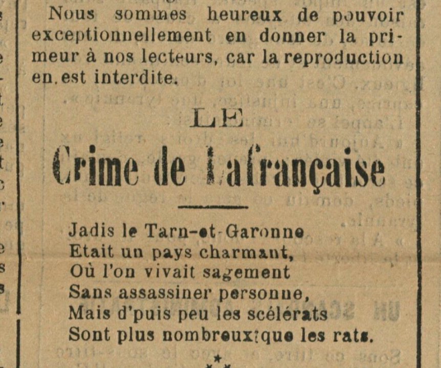 Paru dans Le "Courrier de Tarn-et-Garonne", 14 octobre 1895, soit 15 jours après les faits.